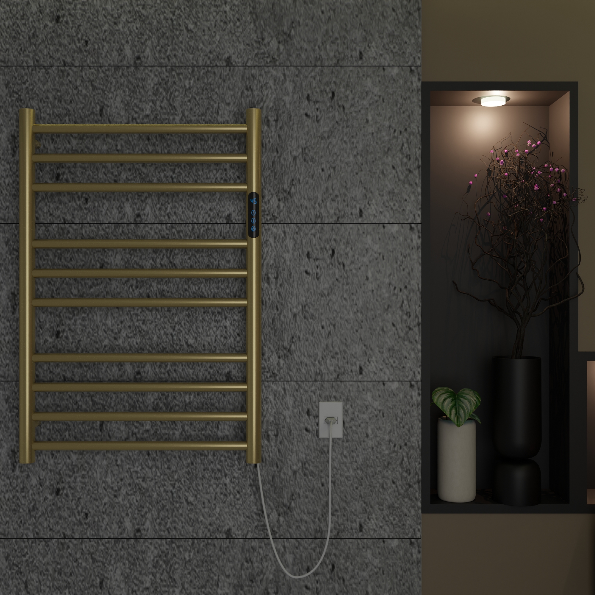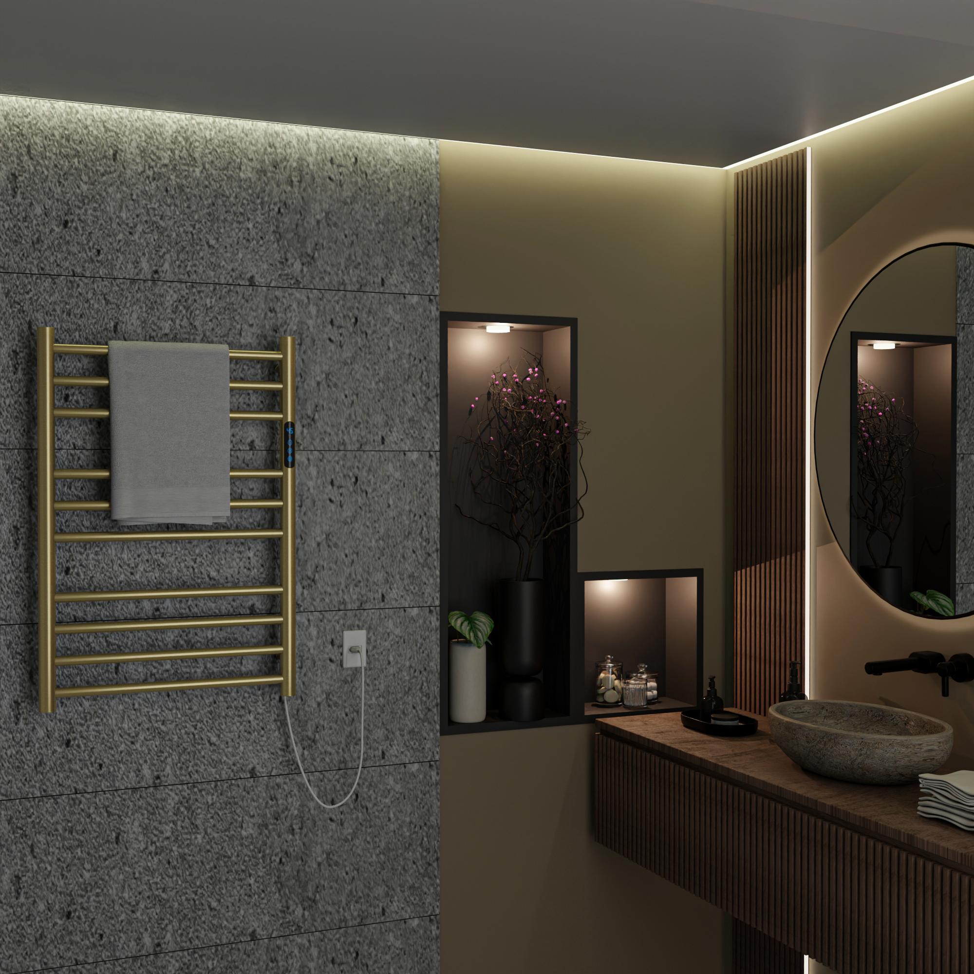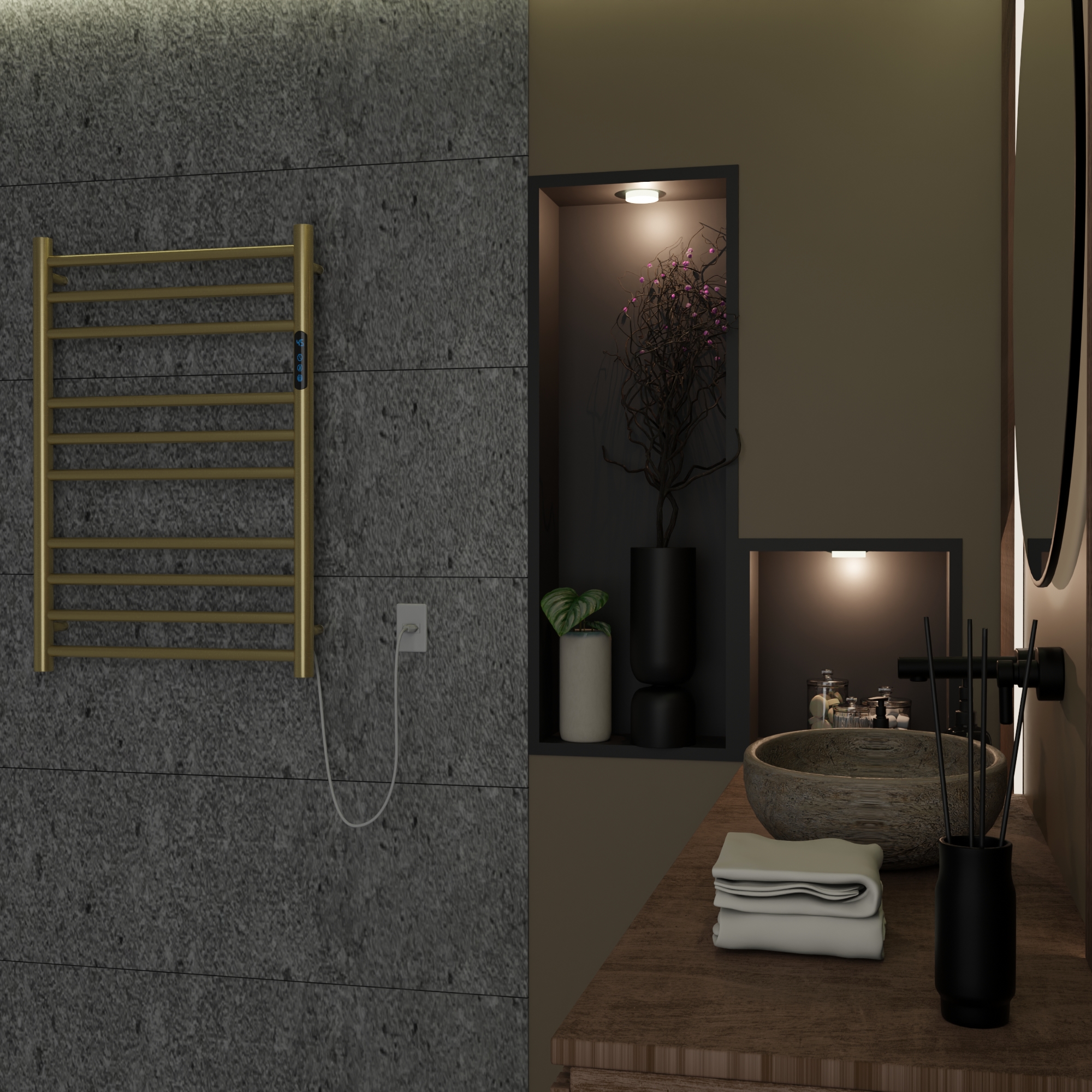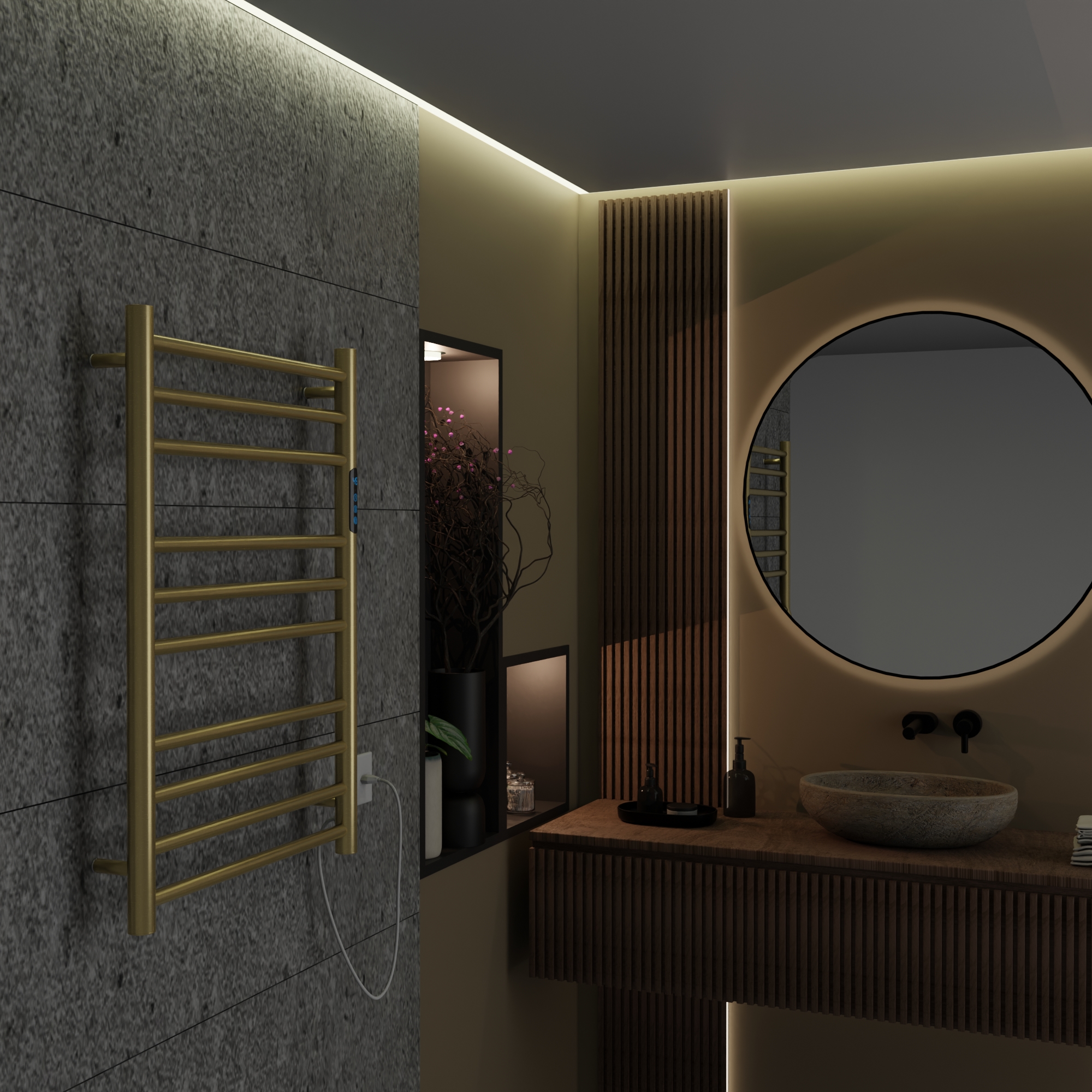 Toalheiro Térmico Kazalinda Redondo Dourado Escovado com Timer Embutido – Fio Lado Direito